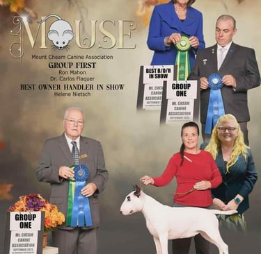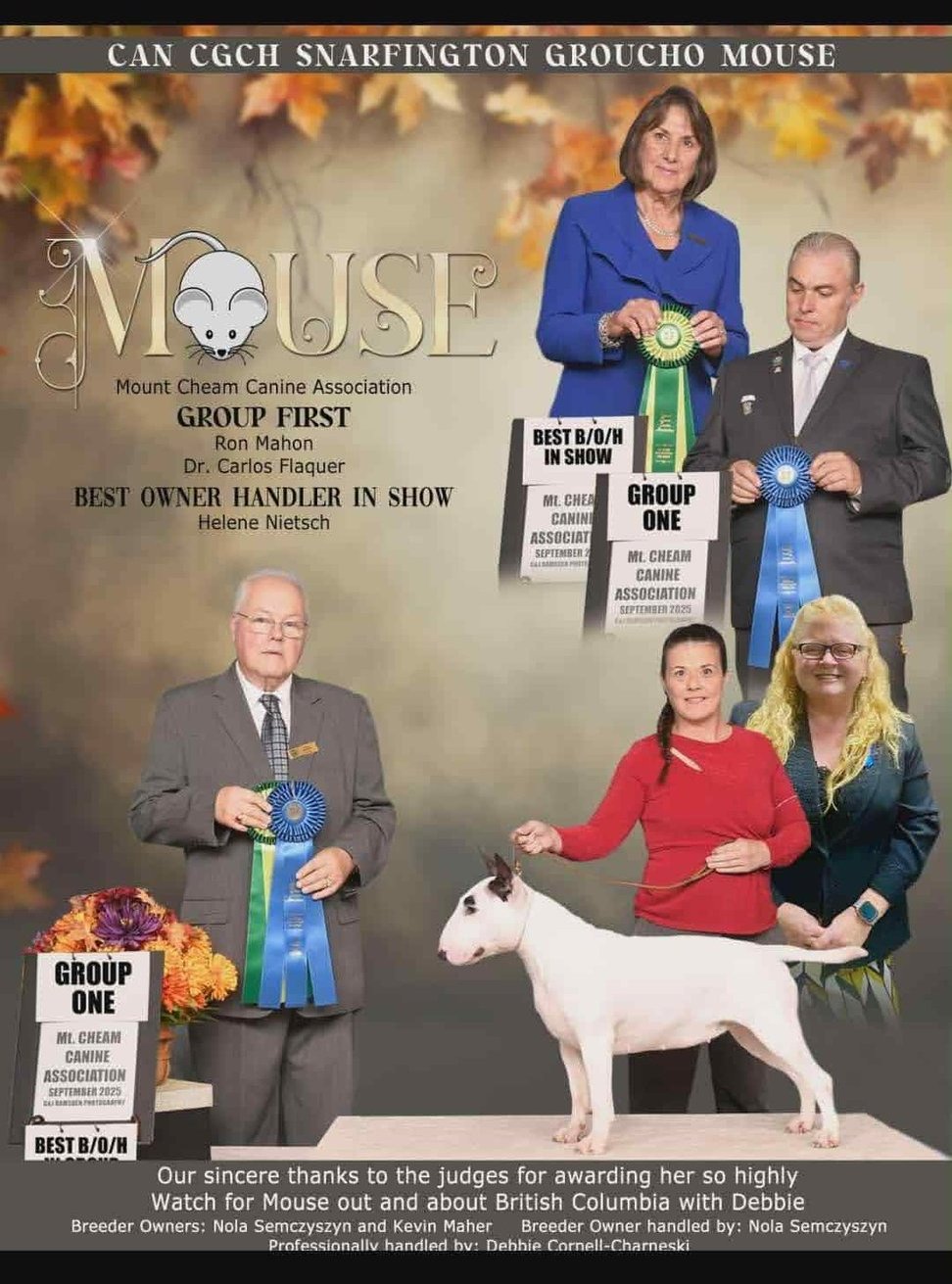 Oct 20, 2025: Mouse has won several awards at the Mt. Cheam Canine Association Dog Show and now ranks in the top 5 Bull Terriers in Canada. Our thanks go out to the judges who recognized her conformation.