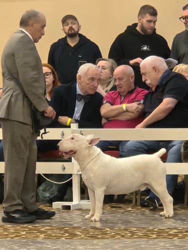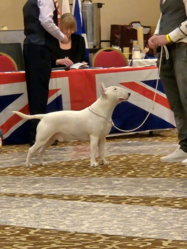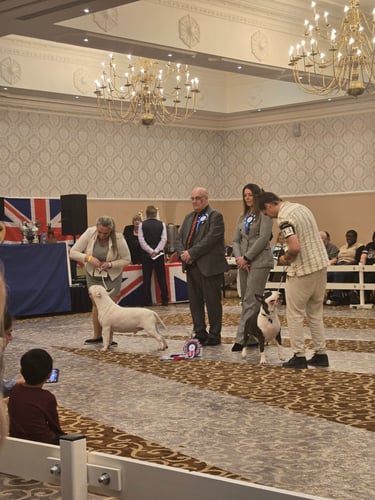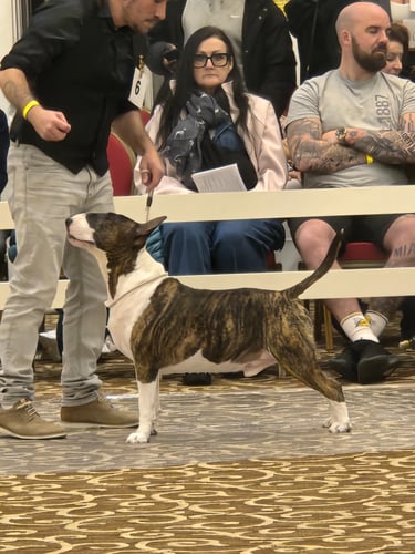 At Snarfington Bull Terriers, we believe conformation dog shows play an essential role in preserving the health, temperament, and structure of the breed. The show ring is where breeding programs are evaluated against the official Canadian Kennel Club (CKC) standard, ensuring that future generations of Bull Terriers remain true to type—balanced, athletic, and full of character. Competing in shows allows our bitches to be assessed by experienced judges, while also giving us the opportunity to showcase their quality, celebrate their achievements, and connect with the wider community of responsible breeders. Below you’ll find photos and highlights from recent shows where Snarfington Bull Terriers have proudly represented our kennel.